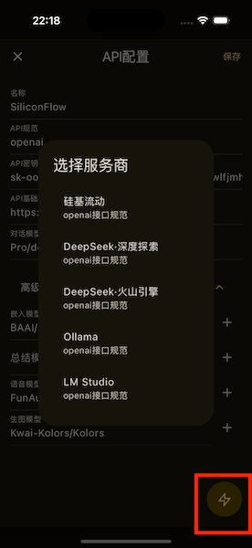 - 输入您的API密钥(注意,点击右下角浮动按钮可以快捷填写预置的服务商配置)